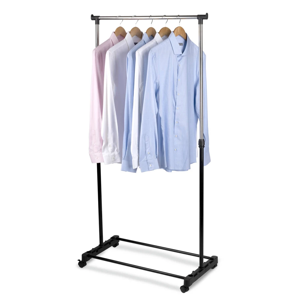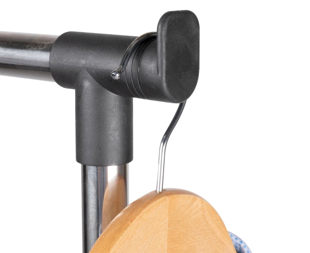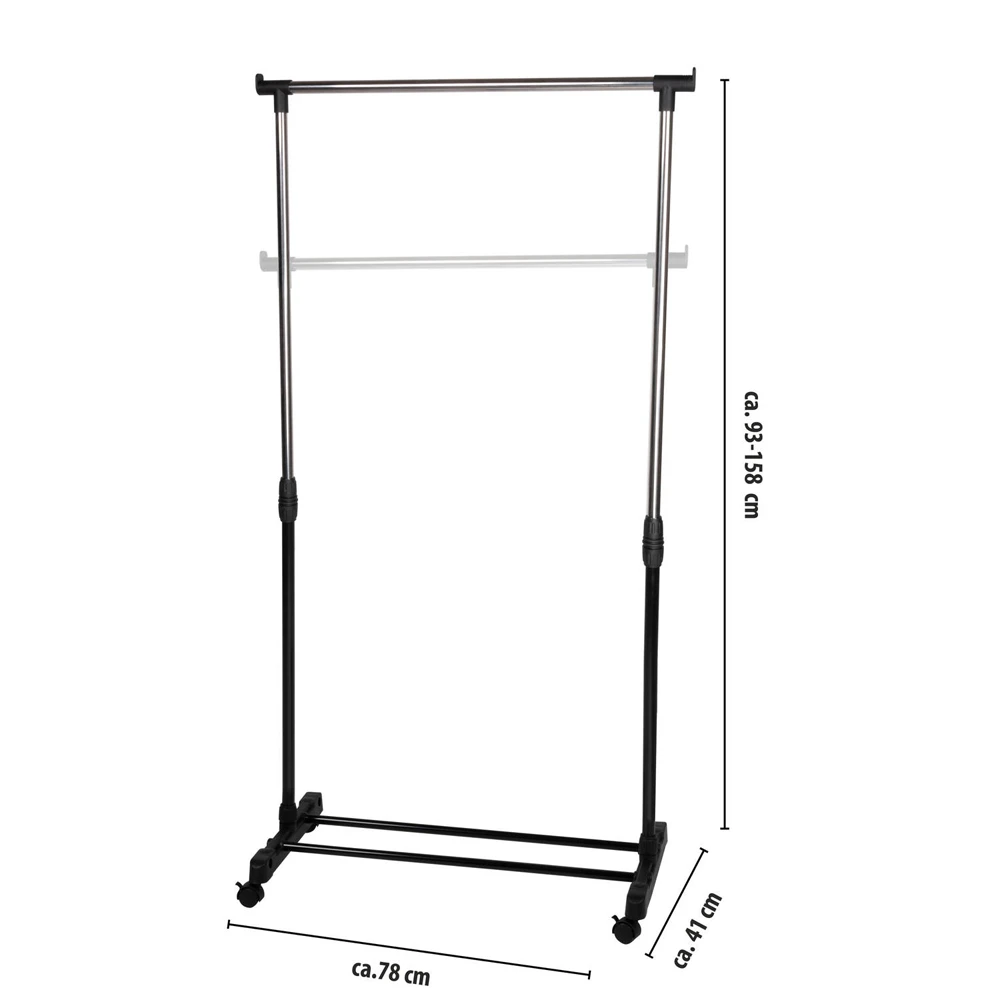 Mobiel kledingrek gemaakt van metaal en kunststof met 4 zwenkwielen. De hoogte is verstelbaar van 90 tot 150 cm. Maximale belasting: 35 kg. Afmeting: 80 x 42 x 150 cm.