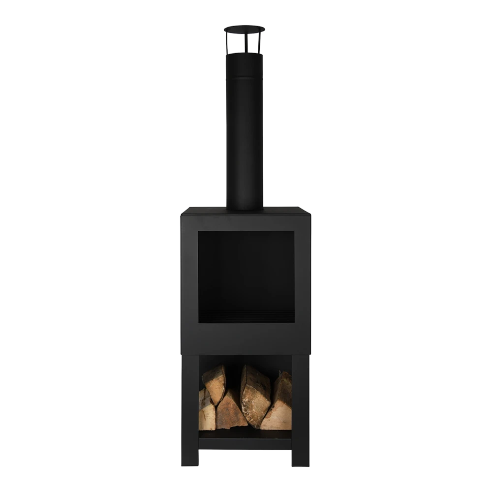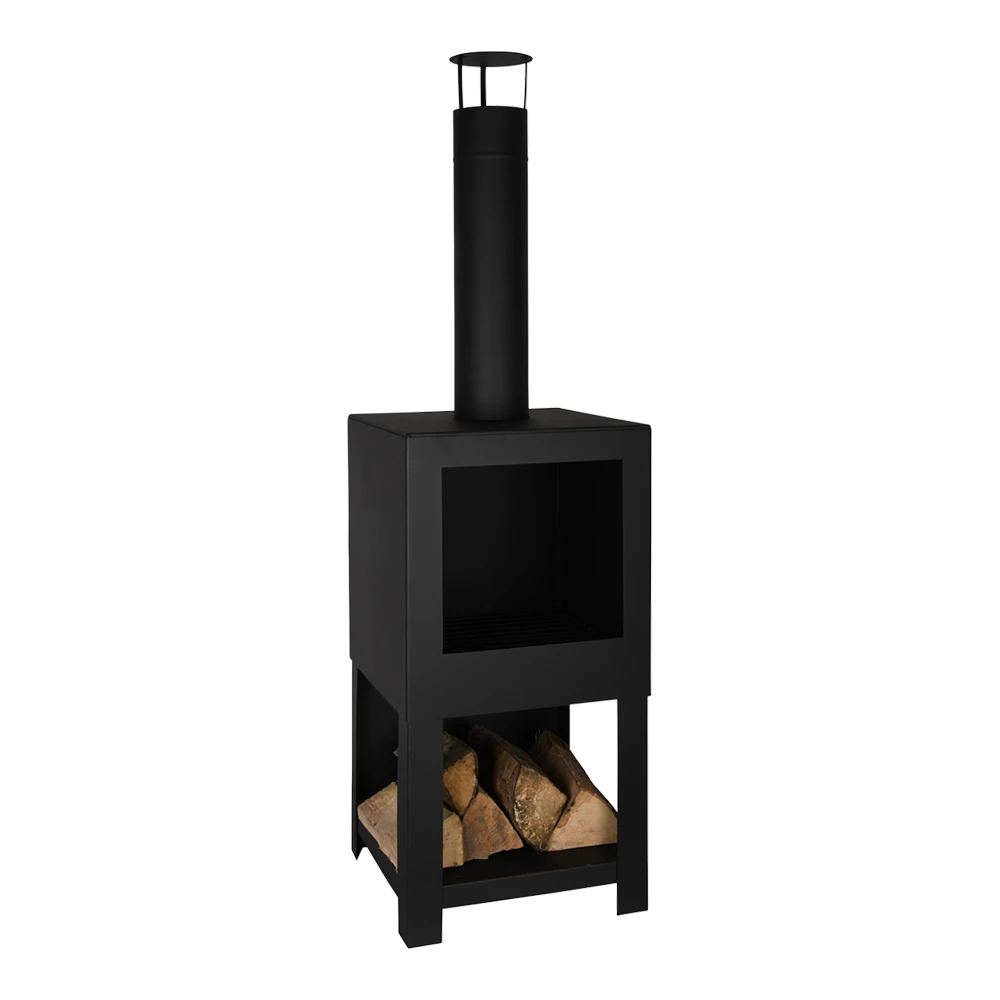 Geniet van een knisperend vuur in de tuin! Deze strak vormgegeven terraskachel heeft een houtopslag onder de kachel.